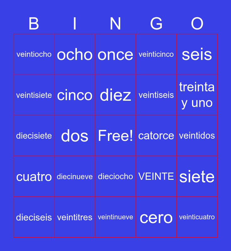 This bingo card has a free space and 32 words: cero, uno, dos, tres, cuatro, cinco, seis, siete, ocho, nueve, diez, once, doce, trece, catorce, quince, dieciseis, diecisiete, dieciocho, diecinueve, VEINTE, veintiuno, veintidos, veintitres, veinticuatro, veinticinco, veintiseis, veintisiete, veintiocho, veintinueve, treinta and treinta y uno.