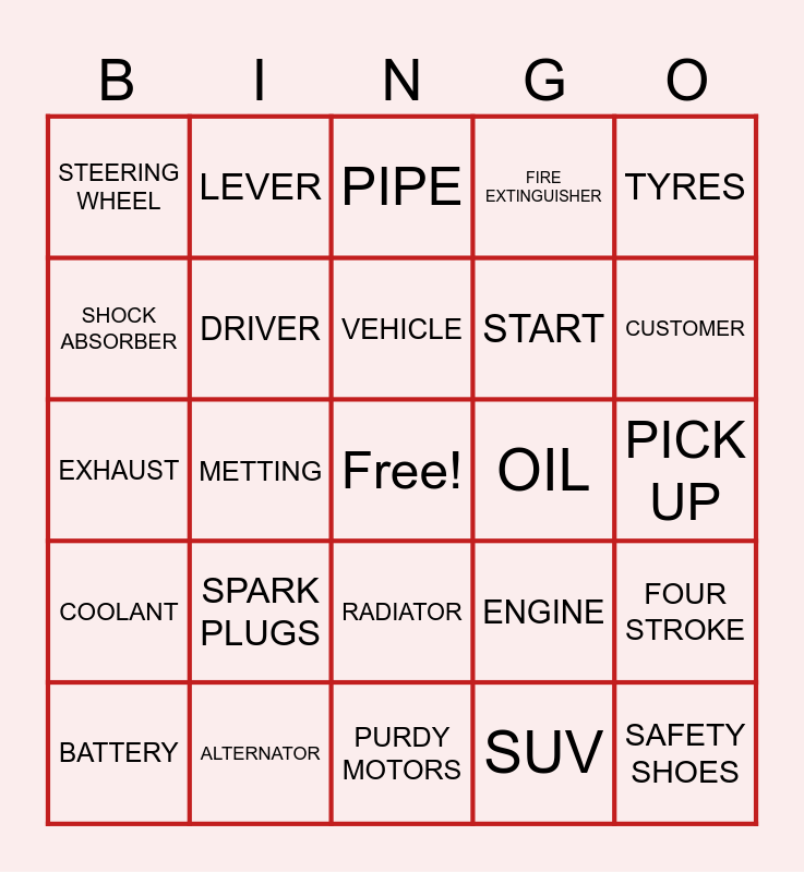 This bingo card has a free space and 24 words: SPARK PLUGS, ALTERNATOR, VEHICLE, BATTERY, TYRES, STEERING WHEEL, SHOCK ABSORBER, LEVER, OIL, RADIATOR, START, EXHAUST, ENGINE, FOUR STROKE, DRIVER, SUV, PICK UP, PIPE, CUSTOMER, METTING, SAFETY SHOES, COOLANT, FIRE EXTINGUISHER and PURDY MOTORS.