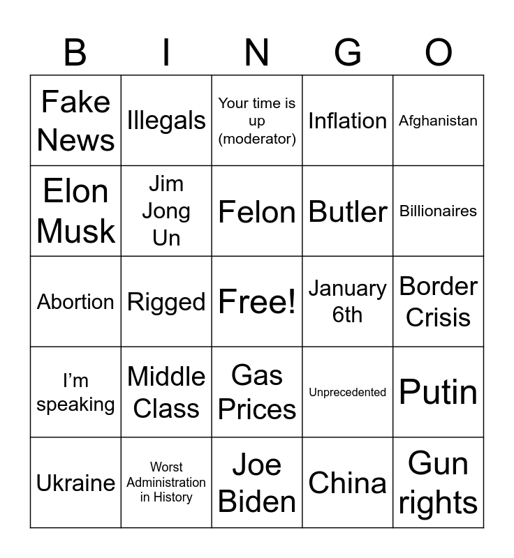 This bingo card has a free space and 37 words: Communism, Climate change, Radical, Jim Jong Un, Putin, Middle Class, Felon, J.D. Vance, Afghanistan, Pittsburgh, Rigged, Inflation, Gun rights, Border Crisis, Elon Musk, I’m speaking, Assassination Attempt, Your time is up (moderator), Gas Prices, January 6th, Fake News, Billionaires, Ukraine, Joe Biden, Economy, China, Illegals, Impeachment, Charlottesville, Tim Walz, Jobs, Worst Administration in History, Abortion, Lockdown, Unprecedented, Butler and NATO.