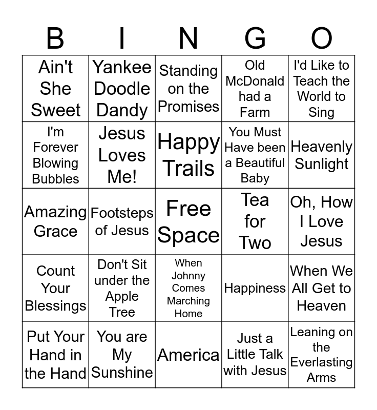 This bingo card has a free space and 24 words: Don't Sit under the Apple Tree, You are My Sunshine, Happy Trails, Put Your Hand in the Hand, I'd Like to Teach the World to Sing, Ain't She Sweet, I'm Forever Blowing Bubbles, Yankee Doodle Dandy, Tea for Two, When Johnny Comes Marching Home, You Must Have been a Beautiful Baby, Amazing Grace, Happiness, When We All Get to Heaven, Jesus Loves Me!, Just a Little Talk with Jesus, Oh, How I Love Jesus, Standing on the Promises, Heavenly Sunlight, Footsteps of Jesus, Leaning on the Everlasting Arms, Count Your Blessings, Old McDonald had a Farm and America.