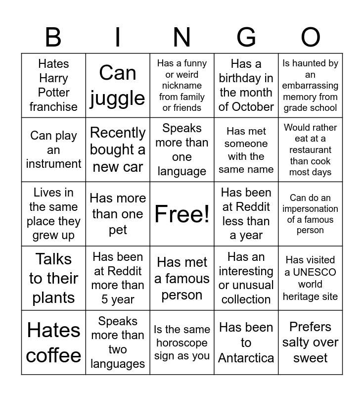 This bingo card has a free space and 26 words: Has met a famous person, Has been to Antarctica, Speaks more than one language, Speaks more than two languages, Is haunted by an embarrassing memory from grade school, Hates Harry Potter franchise, Can play an instrument, Can juggle, Can do an impersonation of a famous person, Has an interesting or unusual collection, Has met someone with the same name, Lives in the same place they grew up, Has visited a UNESCO world heritage site, Hates coffee, Has more than one pet, Has a mailing subscription to a magazine or newspaper, Has a birthday in the month of October, Talks to their plants, Has a funny or weird nickname from family or friends, Prefers salty over sweet, Would rather eat at a restaurant than cook most days, Is the same horoscope sign as you, Has been at Reddit less than a year, Has been at Reddit more than 5 year, Recently bought a new car and Has never lived in the Bay Area.
