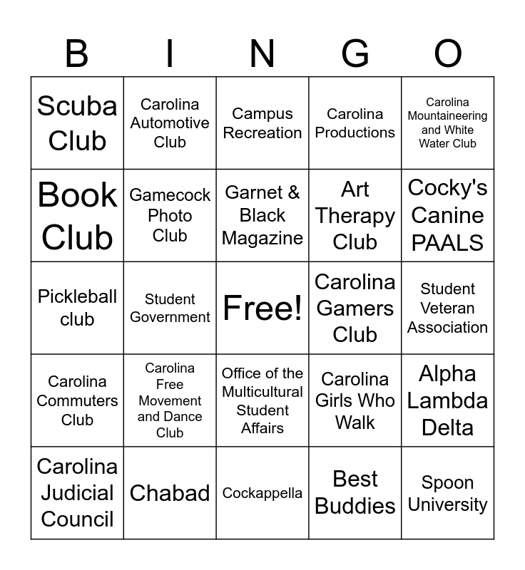 This bingo card has a free space and 28 words: Alpha Lambda Delta, American Sign Language Club, Art Therapy Club, Best Buddies, Book Club, Campus Recreation, Carolina Automotive Club, Carolina Commuters Club, Carolina Gamers Club, Carolina Judicial Council, Pickleball club, Carolina Productions, Chabad, Cockappella, Cocky's Canine PAALS, Dance Marathon, Carolina Free Movement and Dance Club, Gamecock Photo Club, Garnet & Black Magazine, Office of the Multicultural Student Affairs, Scuba Club, Gamecock Esports Club, Spoon University, Student Government, Student Veteran Association, Carolina Girls Who Walk, Carolina Mountaineering and White Water Club and American Marketing Association.