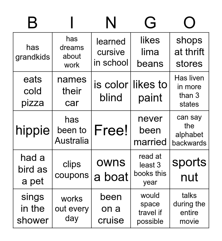 This bingo card has a free space and 24 words: clips coupons, works out every day, is color blind, sings in the shower, shops at thrift stores, has grandkids, eats cold pizza, has dreams about work, never been married, owns a boat, likes to paint, hippie, read at least 3 books this year, sports nut, names their car, would space travel if possible, can say the alphabet backwards, learned cursive in school, Has liven in more than 3 states, has been to Australia, talks during the entire movie, had a bird as a pet, likes lima beans and been on a cruise.