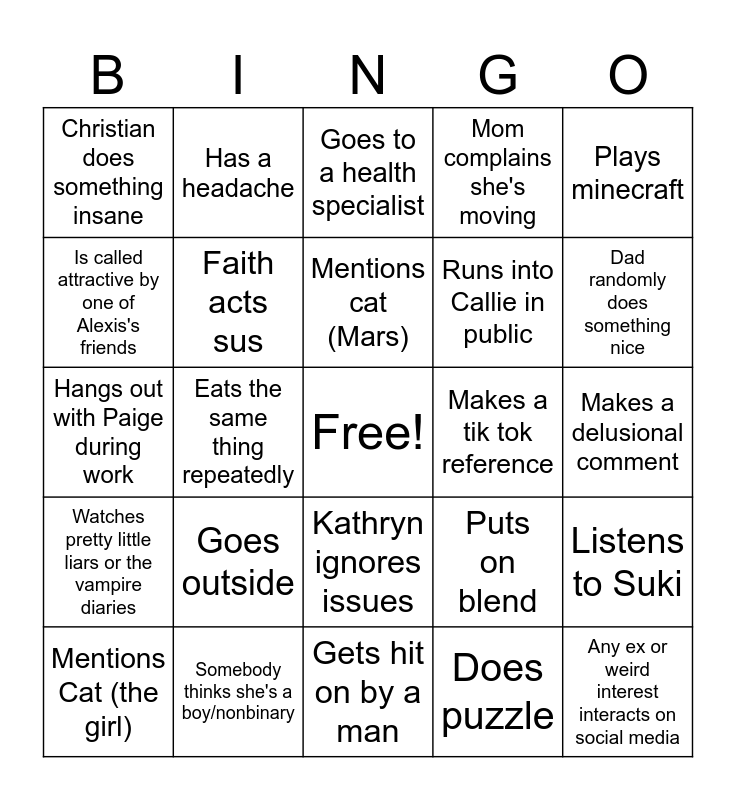 This bingo card has a free space and 24 words: Mentions Cat (the girl), Goes outside, Mentions cat (Mars), Does puzzle, Plays minecraft, Christian does something insane, Has a headache, Goes to a health specialist, Makes a tik tok reference, Makes a delusional comment, Hangs out with Paige during work, Faith acts sus, Puts on blend, Listens to Suki, Is called attractive by one of Alexis's friends, Somebody thinks she's a boy/nonbinary, Gets hit on by a man, Mom complains she's moving, Dad randomly does something nice, Watches pretty little liars or the vampire diaries, Eats the same thing repeatedly, Kathryn ignores issues, Runs into Callie in public and Any ex or weird interest interacts on social media.