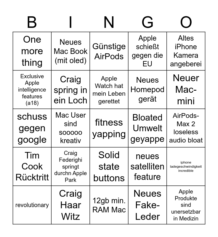 This bingo card has a free space and 24 words: Craig Federighi springt durchn Apple Park, Craig Haar Witz, Apple Watch hat mein Leben gerettet, revolutionary, Altes iPhone Kamera angeberei, One more thing, Exclusive Apple intelligence features (a18), Neues Mac Book (mit oled), Bloated Umwelt geyappe, Solid state buttons, Neues Homepod gerät, schuss gegen google, neues satelliten feature, iphone ladegeschwindigkeit incredible, Craig spring in ein Loch, Neues Fake-Leder, AirPods-Max 2 loseless audio bloat, Günstige AirPods, Neuer Mac-mini, Mac User sind sooooo kreativ, Apple Produkte sind unersetzbar in Medizin, Tim Cook Rücktritt, Apple schießt gegen die EU and 12gb min. RAM Mac.