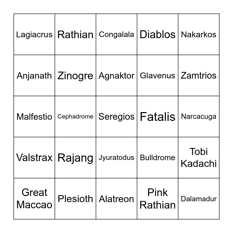 This bingo card has 25 words: Rajang, Alatreon, Agnaktor, Great Maccao, Nakarkos, Lagiacrus, Anjanath, Rathian, Fatalis, Jyuratodus, Glavenus, Malfestio, Bulldrome, Tobi Kadachi, Zinogre, Dalamadur, Narcacuga, Congalala, Zamtrios, Cephadrome, Seregios, Plesioth, Valstrax, Diablos and Pink Rathian.