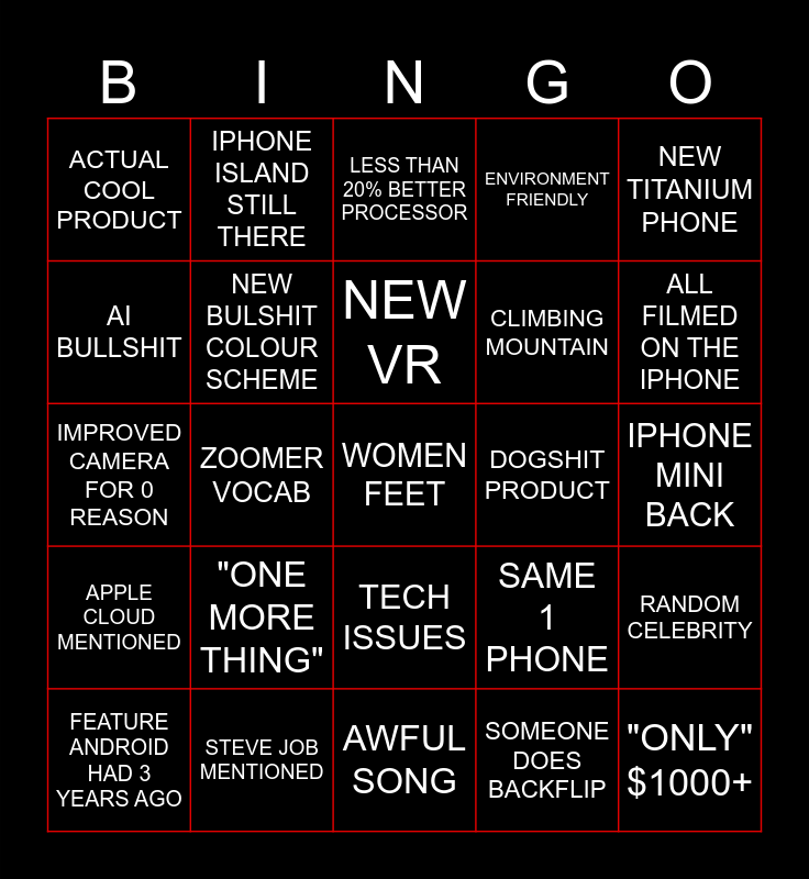 This bingo card has a free space and 24 words: "ONE MORE THING", STEVE JOB MENTIONED, NEW VR, FEATURE ANDROID HAD 3 YEARS AGO, NEW TITANIUM PHONE, ACTUAL COOL PRODUCT, AI BULLSHIT, IPHONE ISLAND STILL THERE, DOGSHIT PRODUCT, TECH ISSUES, CLIMBING MOUNTAIN, IMPROVED CAMERA FOR 0 REASON, SAME 1 PHONE, RANDOM CELEBRITY, NEW BULSHIT COLOUR SCHEME, SOMEONE DOES BACKFLIP, IPHONE MINI BACK, LESS THAN 20% BETTER PROCESSOR, ALL FILMED ON THE IPHONE, ZOOMER VOCAB, "ONLY" $1000+, APPLE CLOUD MENTIONED, ENVIRONMENT FRIENDLY and AWFUL SONG.