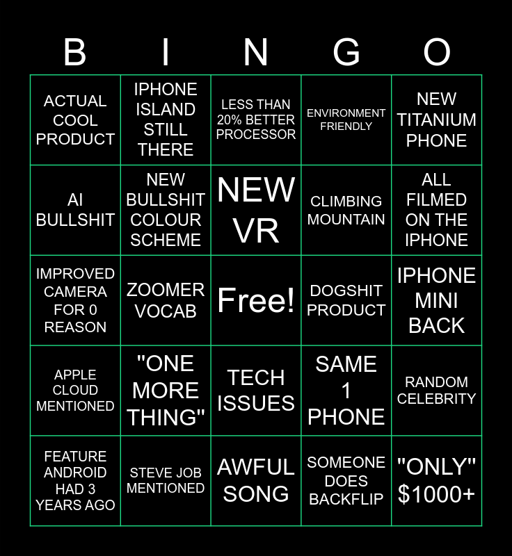 This bingo card has a free space and 24 words: ''ONE MORE THING'', STEVE JOB MENTIONED, NEW VR, FEATURE ANDROID HAD 3 YEARS AGO, NEW TITANIUM PHONE, ACTUAL COOL PRODUCT, AI BULLSHIT, IPHONE ISLAND STILL THERE, DOGSHIT PRODUCT, TECH ISSUES, CLIMBING MOUNTAIN, IMPROVED CAMERA FOR 0 REASON, SAME 1 PHONE, RANDOM CELEBRITY, NEW BULLSHIT COLOUR SCHEME, SOMEONE DOES BACKFLIP, IPHONE MINI BACK, LESS THAN 20% BETTER PROCESSOR, ALL FILMED ON THE IPHONE, ZOOMER VOCAB, ''ONLY'' $1000+, APPLE CLOUD MENTIONED, ENVIRONMENT FRIENDLY and AWFUL SONG.