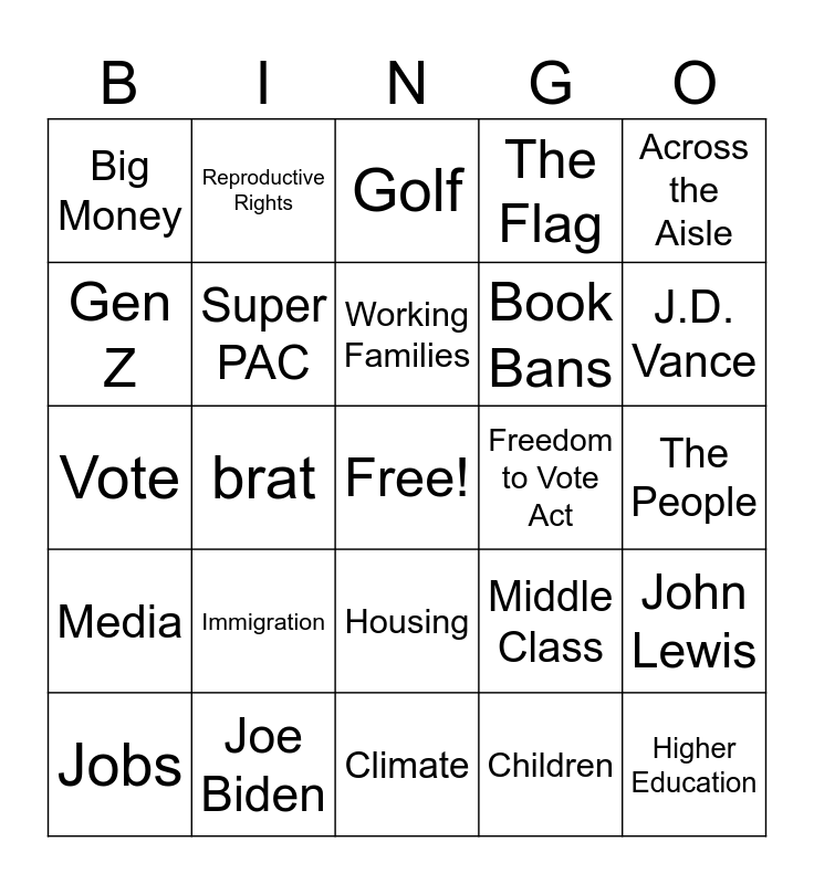 This bingo card has a free space and 45 words: Women, Higher Education, Historic, Jobs, Supreme Court, Children, Golf, November, Across the Aisle, Joe Biden, The Flag, Freedom to Vote Act, Housing, Immigration, God, Climate, Congress, Vote, Mute Button, J.D. Vance, Reproductive Rights, Equality, Dream, Big Money, United, The People, Poll Workers, ERA, Middle Class, Media, Future, John Lewis, Democracy, Young Voters, Economy, brat, Heroes, TikTok, Divided, Working Families, Gen Z, Book Bans, Tim Walz, Super PAC and Any female pop star.