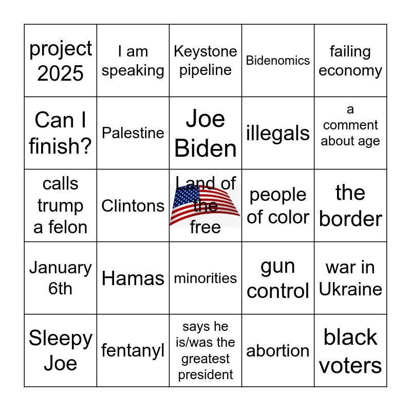 This bingo card has a free space and 24 words: Hamas, fentanyl, Joe Biden, Sleepy Joe, failing economy, project 2025, Can I finish?, I am speaking, people of color, minorities, illegals, calls trump a felon, gun control, war in Ukraine, Palestine, abortion, the border, Keystone pipeline, a comment about age, Clintons, black voters, January 6th, Bidenomics and says he is/was the greatest president.
