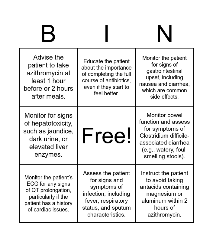 This bingo card has a free space and 10 words: Assess the patient for signs and symptoms of infection, including fever, respiratory status, and sputum characteristics., Monitor the patient for signs of gastrointestinal upset, including nausea and diarrhea, which are common side effects., Advise the patient to take azithromycin at least 1 hour before or 2 hours after meals., Instruct the patient to avoid taking antacids containing magnesium or aluminum within 2 hours of azithromycin., Monitor for signs of hepatotoxicity, such as jaundice, dark urine, or elevated liver enzymes., Monitor the patient’s ECG for any signs of QT prolongation, particularly if the patient has a history of cardiac issues., Educate the patient about the importance of completing the full course of antibiotics, even if they start to feel better., Assess for signs of allergic reactions such as rash, hives, or difficulty breathing., Monitor bowel function and assess for symptoms of Clostridium difficile-associated diarrhea (e.g., watery, foul-smelling stools). and Check the patient’s current medication regimen for potential drug interactions, especially those that prolong the QT interval or increase bleeding risk..