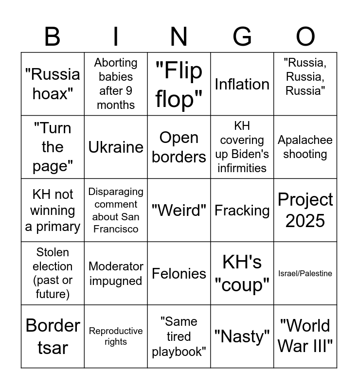 This bingo card has 25 words: Moderator impugned, "Same tired playbook", Open borders, Border tsar, "Russia, Russia, Russia", "Russia hoax", "Turn the page", Aborting babies after 9 months, Fracking, Felonies, KH covering up Biden's infirmities, KH not winning a primary, KH's "coup", Israel/Palestine, Ukraine, "World War III", Project 2025, "Flip flop", Apalachee shooting, Disparaging comment about San Francisco, "Weird", Reproductive rights, Stolen election (past or future), Inflation and "Nasty".