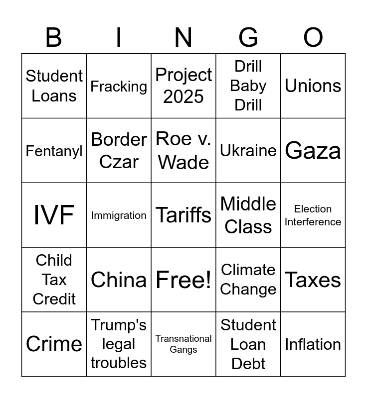 This bingo card has 26 words: Free!, Student Loan Debt, Roe v. Wade, Trump's legal troubles, Unions, Student Loans, Fentanyl, Fracking, Election Interference, Climate Change, Ukraine, IVF, Taxes, Crime, Immigration, LGBTQ+, Drill Baby Drill, Child Tax Credit, Project 2025, Tariffs, Gaza, Transnational Gangs, Middle Class, China, Border Czar and Inflation.