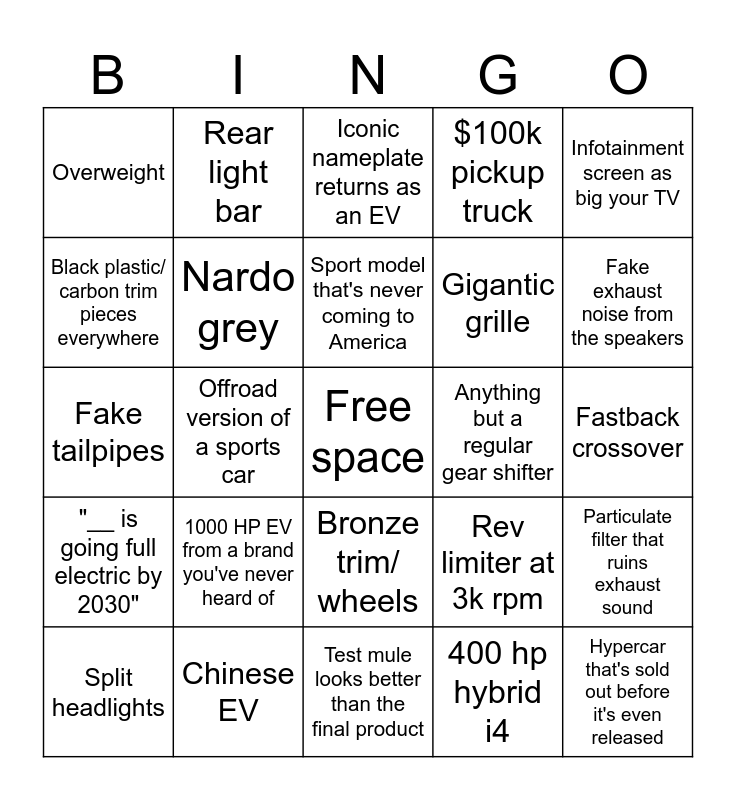 This bingo card has a free space and 24 words: 1000 HP EV from a brand you've never heard of, Chinese EV, Sport model that's never coming to America, Split headlights, Infotainment screen as big your TV, Overweight, Black plastic/ carbon trim pieces everywhere, Rear light bar, Anything but a regular gear shifter, Bronze trim/ wheels, Gigantic grille, Fake tailpipes, Rev limiter at 3k rpm, Particulate filter that ruins exhaust sound, Nardo grey, 400 hp hybrid i4, Fastback crossover, Iconic nameplate returns as an EV, Fake exhaust noise from the speakers, Offroad version of a sports car, Hypercar that's sold out before it's even released, "__ is going full electric by 2030", $100k pickup truck and Test mule looks better than the final product.
