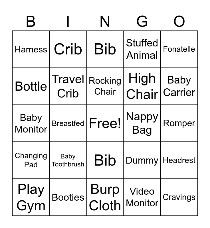 This bingo card has a free space and 27 words: Dummy, Onesie, High Chair, Burp Cloth, Bottle, Bib, Crib, Changing Pad, Nappy Bag, Headrest, Baby Monitor, Stuffed Animal, Play Gym, Booties, Baby Carrier, Bottle Warmer, Travel Crib, Rocking Chair, Baby Toothbrush, Harness, Romper, Video Monitor, Breastfed, Cravings, Bib, Fonatelle and Rattle.