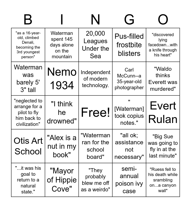 This bingo card has a free space and 24 words: "Alex is a nut in my book", "Mayor of Hippie Cove", Independent of modern technology., "...it was his goal to return to a natural state.", "discovered lying facedown...with a knife through his heart", "as a 16-year-old, climbed Denali, becoming the 3rd youngest person", Waterman was barely 5' 3" tall, Waterman spent 145 days alone on the mountain, "[Waterman] took copius notes.", "Waterman ran for the school board", Carl McCunn--a 35-year-old photographer, "neglected to arrange for a pilot to fly him back to civilization", "all ok; assistance not necessary", "Big Sue was going to fly in at the last minute", Nemo 1934, semi-annual poison ivy case, Evert Rulan, 20,000 Leagues Under the Sea, "Waldo thinks Everett was murdered", "I think he drowned", "Ruess fell to his death while srambling on...a canyon wall", Otis Art School, Pus-filled frostbite blisters and "They probably blew me off as a weirdo".