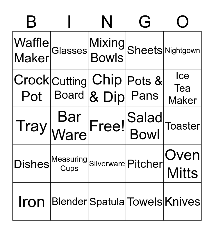 This bingo card has a free space and 24 words: Measuring Cups, Blender, Chip & Dip, Iron, Nightgown, Waffle Maker, Crock Pot, Glasses, Salad Bowl, Silverware, Pots & Pans, Tray, Pitcher, Oven Mitts, Cutting Board, Towels, Toaster, Mixing Bowls, Ice Tea Maker, Bar Ware, Knives, Dishes, Sheets and Spatula.