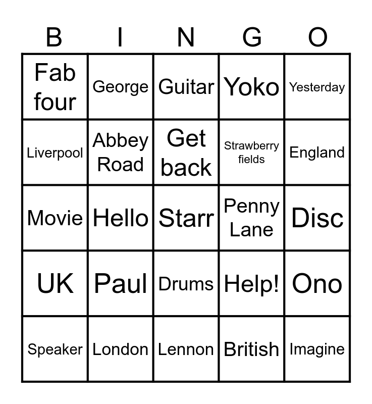 This bingo card has 50 words: Ringo, Starr, John, Lennon, Paul, McCartney, George, Harrison, Liverpool, Yellow, Abbey Road, Yoko, Ono, Help!, Let it be, Hey Jude, Get back, Penny Lane, All you need is love, Yesterday, Hello, British, Fab four, Strawberry fields, forever, Imagine, England, Peace, Guitar, Drums, Bass, Voice, Music, Songs, London, St. Pepper, Famous, Greatest, Fans, Disc, Concert, Microphone, Sound, Glasses, Speaker, Movie, Submarine, Goodbye, UK and Big Ben.