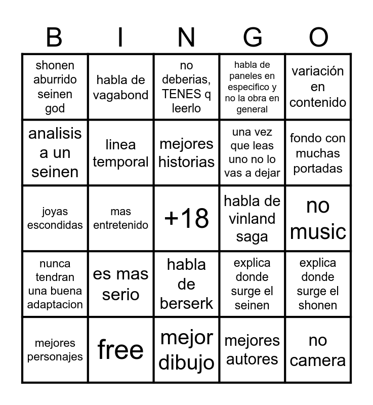 This bingo card has 25 words: es mas serio, mejor dibujo, mejores historias, mejores personajes, variación en contenido, shonen aburrido seinen god, analisis a un seinen, habla de vagabond, habla de vinland saga, habla de berserk, una vez que leas uno no lo vas a dejar, joyas escondidas, explica donde surge el seinen, explica donde surge el shonen, linea temporal, no camera, no music, no deberias, TENES q leerlo, fondo con muchas portadas, mas entretenido, +18, free, nunca tendran una buena adaptacion, habla de paneles en especifico y no la obra en general and mejores autores.