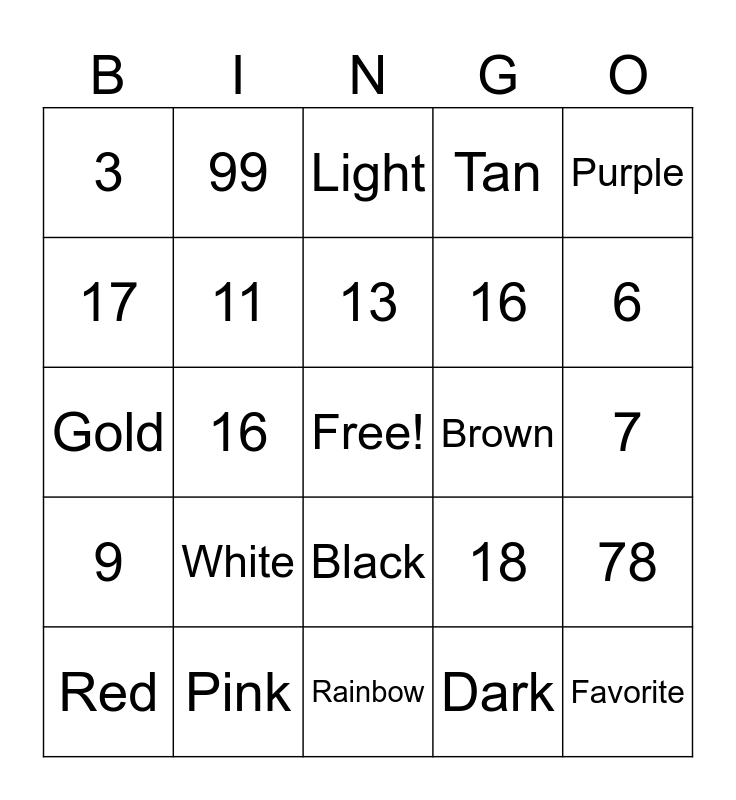 This bingo card has a free space and 44 words: Color, Favorite, Blue, Red, Green, Dark, Light, Yellow, Purple, Pink, Tan, Brown, Black, White, Gray, Rainbow, Orange, Gold, Silver, 6, 99, Name, 66, 3, 33, 7, 14, 15, 18, 9, 10, 78, 87, Nice, 16, 5, 67, 76, 13, 17, 16, 19, 11 and 12.