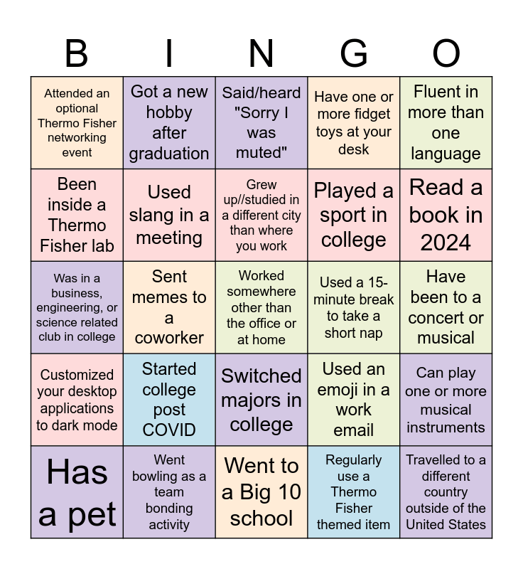This bingo card has 25 words: Started college post COVID, Went to a Big 10 school, Grew up//studied in a different city than where you work, Has a pet, Fluent in more than one language, Attended an optional Thermo Fisher networking event, Been inside a Thermo Fisher lab, Got a new hobby after graduation, Used a 15-minute break to take a short nap, Switched majors in college, Played a sport in college, Was in a business, engineering, or science related club in college, Used an emoji in a work email, Can play one or more musical instruments, Used slang in a meeting, Travelled to a different country outside of the United States, Have been to a concert or musical, Said/heard "Sorry I was muted", Read a book in 2024, Sent memes to a coworker, Worked somewhere other than the office or at home, Went bowling as a team bonding activity, Customized your desktop applications to dark mode, Have one or more fidget toys at your desk and Regularly use a Thermo Fisher themed item.