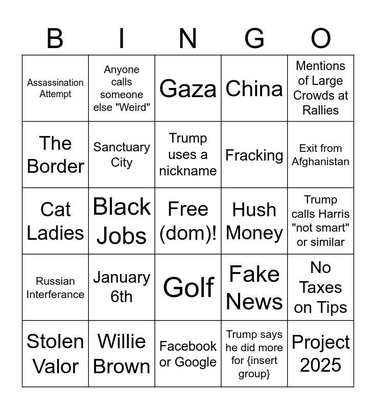 This bingo card has a free space and 24 words: January 6th, Willie Brown, Trump uses a nickname, Stolen Valor, Mentions of Large Crowds at Rallies, Assassination Attempt, The Border, Anyone calls someone else "Weird", Hush Money, Golf, Fracking, Cat Ladies, Fake News, No Taxes on Tips, Sanctuary City, Trump says he did more for {insert group}, Trump calls Harris "not smart" or similar, Gaza, Exit from Afghanistan, Black Jobs, Project 2025, Russian Interferance, China and Facebook or Google.