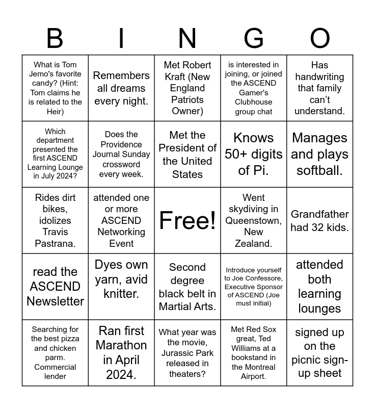This bingo card has a free space and 24 words: Dyes own yarn, avid knitter., Ran first Marathon in April 2024., Met the President of the United States, Searching for the best pizza and chicken parm. Commercial lender, Has handwriting that family can’t understand., What is Tom Jemo's favorite candy? (Hint: Tom claims he is related to the Heir), Which department presented the first ASCEND Learning Lounge in July 2024?, Remembers all dreams every night., Went skydiving in Queenstown, New Zealand., Second degree black belt in Martial Arts., Knows 50+ digits of Pi., Rides dirt bikes, idolizes Travis Pastrana., Introduce yourself to Joe Confessore, Executive Sponsor of ASCEND (Joe must initial), attended both learning lounges, Does the Providence Journal Sunday crossword every week., Met Red Sox great, Ted Williams at a bookstand in the Montreal Airport., Grandfather had 32 kids., Met Robert Kraft (New England Patriots Owner), Manages and plays softball., attended one or more ASCEND Networking Event, signed up on the picnic sign-up sheet, read the ASCEND Newsletter, is interested in joining, or joined the ASCEND Gamer's Clubhouse group chat and What year was the movie, Jurassic Park released in theaters?.
