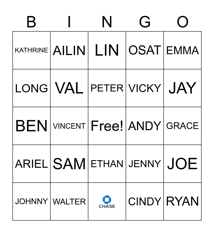 This bingo card has 1 images, a free space and 23 words: SAM, WALTER, PETER, JOHNNY, EMMA, KATHRINE, LONG, AILIN, ANDY, ETHAN, VICKY, BEN, JENNY, JOE, VAL, CINDY, GRACE, LIN, JAY, VINCENT, RYAN, ARIEL and OSAT.