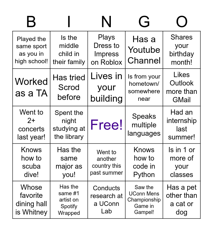 This bingo card has a free space and 24 words: Has the same major as you!, Has the same #1 artist on Spotify Wrapped, Lives in your building, Whose favorite dining hall is Whitney, Shares your birthday month!, Played the same sport as you in high school!, Worked as a TA, Is the middle child in their family, Speaks multiple languages, Went to another country this past summer, Is from your hometown/ somewhere near, Went to 2+ concerts last year!, Knows how to code in Python, Is in 1 or more of your classes, Has tried Scrod before, Saw the UConn Mens Championship Game in Gampel!, Had an internship last summer!, Plays Dress to Impress on Roblox, Likes Outlook more than GMail, Spent the night studying at the library, Has a pet other than a cat or dog, Knows how to scuba dive!, Has a Youtube Channel and Conducts research at a UConn Lab.