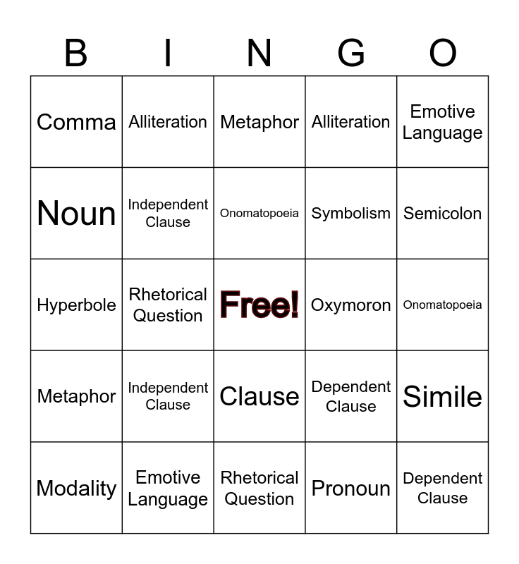 This bingo card has a free space and 36 words: SSemicolon Comma Period Independent Clause Dependent Clause Metaphor Onomatopoeia Simile Emotive Language Modality Rhetorical Question Alliteration Hyperbole Oxymoron Symbolism Noun Verb Conjunction Pronoun Clause Exclamation Mark Que, Comma, Period, Independent Clause, Dependent Clause, Metaphor, Onomatopoeia, Simile, Emotive Language, Modality, Rhetorical Question, Alliteration, Hyperbole, Oxymoron, Semicolon, Comma, Period, Independent Clause, Dependent Clause, Metaphor, Onomatopoeia, Simile, Emotive Language, Modality, Rhetorical Question, Alliteration, Hyperbole, Oxymoron, Symbolism, Noun, Verb, Conjunction, Pronoun, Clause, Exclamation Mark and Question Mark.
