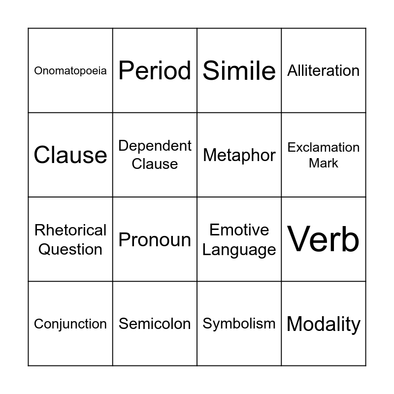 This bingo card has 22 words: Semicolon, Comma, Period, Independent Clause, Dependent Clause, Metaphor, Onomatopoeia, Simile, Emotive Language, Modality, Rhetorical Question, Alliteration, Hyperbole, Oxymoron, Symbolism, Noun, Verb, Conjunction, Pronoun, Clause, Exclamation Mark and Question Mark.