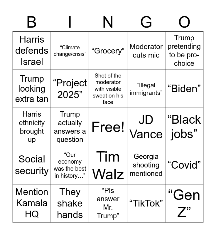 This bingo card has a free space and 24 words: “Our economy was the best in history…”, They shake hands, Shot of the moderator with visible sweat on his face, Mention Kamala HQ, Trump pretending to be pro-choice, Harris defends Israel, Trump looking extra tan, “Climate change/crisis”, JD Vance, Tim Walz, “Illegal immigrants”, Harris ethnicity brought up, Georgia shooting mentioned, “Covid”, “Project 2025”, “TikTok”, “Black jobs”, “Grocery”, “Biden”, Trump actually answers a question, “Gen Z”, Social security, Moderator cuts mic and “Pls answer Mr. Trump”.