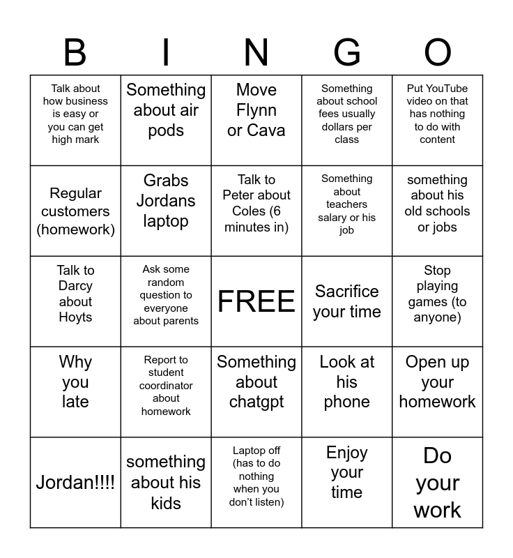 This bingo card has a free space and 24 words: Report to student coordinator about homework, something about his kids, Talk to Peter about Coles (6 minutes in), Jordan!!!!, Put YouTube video on that has nothing to do with content, Talk about how business is easy or you can get high mark, Regular customers (homework), Something about air pods, Sacrifice your time, Something about chatgpt, Something about teachers salary or his job, Talk to Darcy about Hoyts, Look at his phone, Open up your homework, Grabs Jordans laptop, Enjoy your time, Stop playing games (to anyone), Move Flynn or Cava, something about his old schools or jobs, Ask some random question to everyone about parents, Do your work, Why you late, Something about school fees usually dollars per class and Laptop off (has to do nothing when you don’t listen).