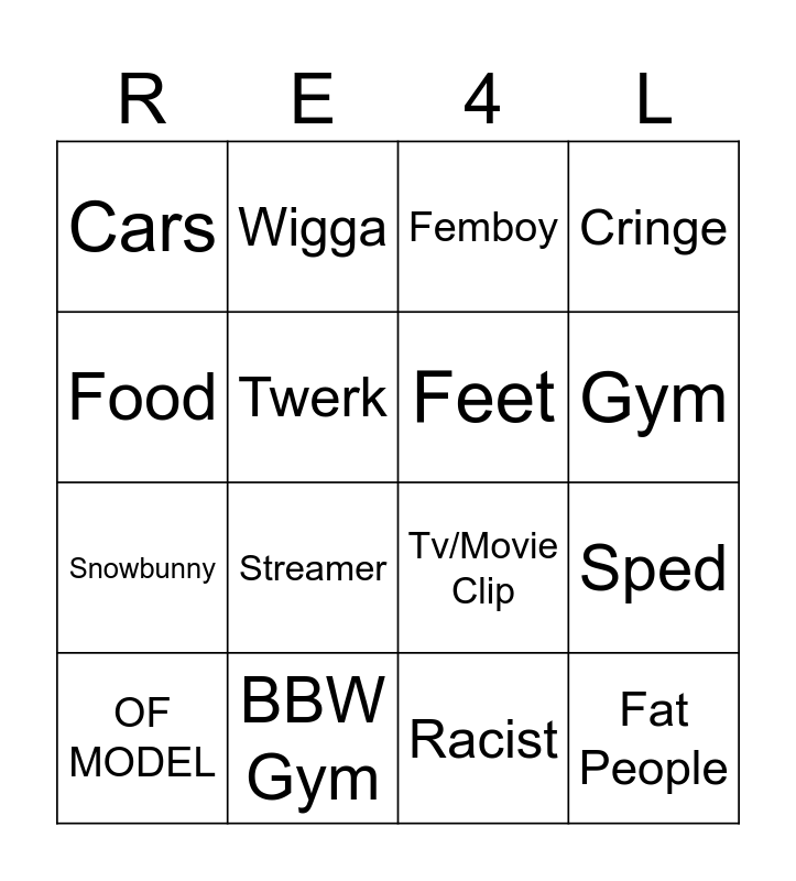 This bingo card has 16 words: BBW Gym, Sped, Femboy, Cars, Snowbunny, Wigga, Tv/Movie Clip, Racist, Food, Twerk, OF MODEL, Cringe, Streamer, Gym, Feet and Fat People.