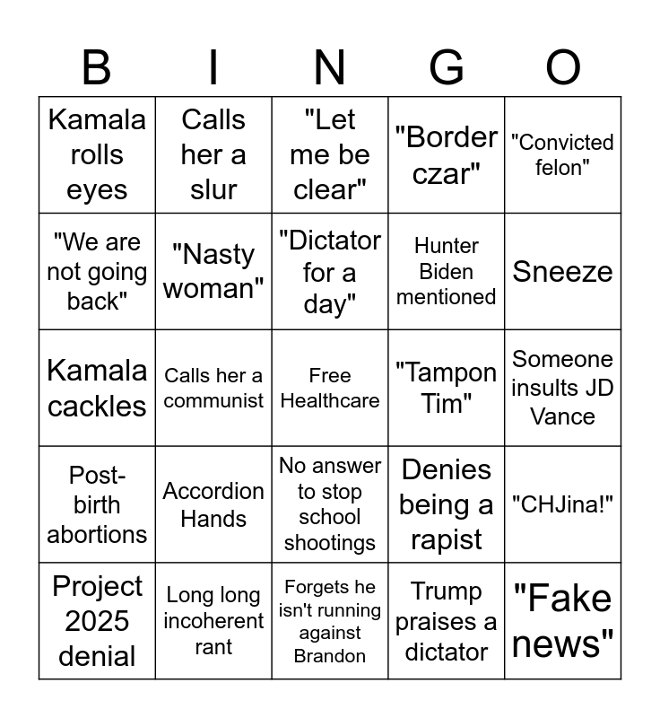 This bingo card has a free space and 24 words: Accordion Hands, Long long incoherent rant, "Dictator for a day", Project 2025 denial, "Convicted felon", Kamala rolls eyes, "We are not going back", Calls her a slur, "Tampon Tim", No answer to stop school shootings, Hunter Biden mentioned, Kamala cackles, Denies being a rapist, "CHJina!", "Nasty woman", Trump praises a dictator, Someone insults JD Vance, "Let me be clear", Sneeze, Calls her a communist, "Fake news", Post-birth abortions, "Border czar" and Forgets he isn't running against Brandon.