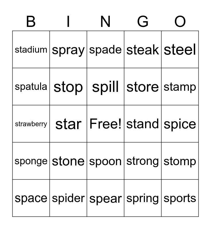 This bingo card has a free space and 40 words: stick, strawberry, spin, stop, spider, spoon, spill, stool, steel, sponge, star, steak, sports, spice, stand, stone, speak, stadium, stove, spade, stomp, spring, store, spatula, speed, special, sticky, storm, spy, spa, sparrow, space, spot, strong, stamp, spear, stage, story, spray and spend.