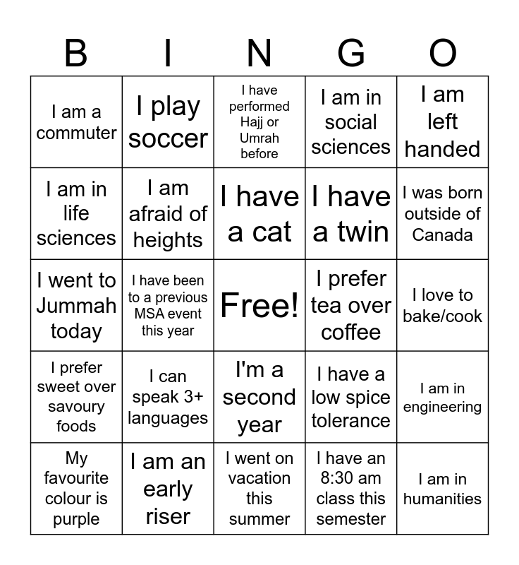 This bingo card has a free space and 24 words: I can speak 3+ languages, I am an early riser, I have a cat, My favourite colour is purple, I am left handed, I am a commuter, I am in life sciences, I play soccer, I prefer tea over coffee, I'm a second year, I have a twin, I went to Jummah today, I have a low spice tolerance, I am in engineering, I am afraid of heights, I have an 8:30 am class this semester, I love to bake/cook, I have performed Hajj or Umrah before, I was born outside of Canada, I have been to a previous MSA event this year, I am in humanities, I prefer sweet over savoury foods, I am in social sciences and I went on vacation this summer.