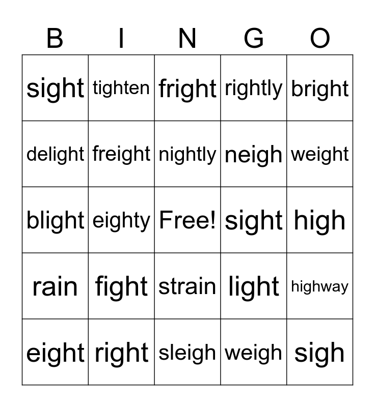 This bingo card has a free space and 29 words: eight, neighbor, eighty, eighteen, sight, fright, freight, fight, sight, right, high, sigh, sleigh, weigh, weight, plain, strain, rain, bright, blight, light, might, neigh, delight, rightly, tighten, highway, nightly and weightless.