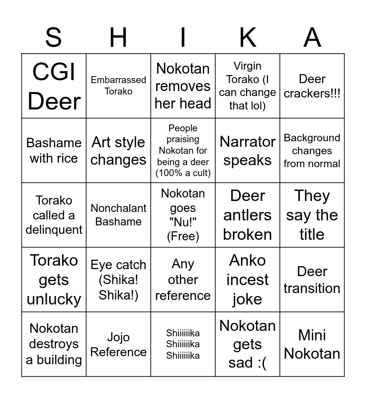 This bingo card has a free space and 24 words: Eye catch (Shika! Shika!), Jojo Reference, People praising Nokotan for being a deer (100% a cult), Nokotan destroys a building, Deer crackers!!!, CGI Deer, Bashame with rice, Embarrassed Torako, Deer antlers broken, Any other reference, Narrator speaks, Torako called a delinquent, Anko incest joke, Deer transition, Art style changes, Nokotan gets sad :(, They say the title, Nokotan removes her head, Background changes from normal, Nonchalant Bashame, Mini Nokotan, Torako gets unlucky, Virgin Torako (I can change that lol) and Shiiiiiika Shiiiiiika Shiiiiiika.