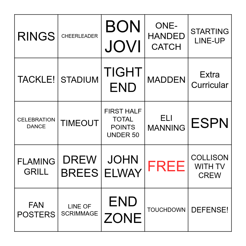This bingo card has 25 words: DREW BREES, END ZONE, TIGHT END, FAN POSTERS, STARTING LINE-UP, RINGS, TACKLE!, CHEERLEADER, ELI MANNING, JOHN ELWAY, MADDEN, CELEBRATION DANCE, FREE, COLLISON WITH TV CREW, STADIUM, DEFENSE!, ESPN, BON JOVI, Extra Curricular, TIMEOUT, FIRST HALF TOTAL POINTS UNDER 50, LINE OF SCRIMMAGE, FLAMING GRILL, ONE-HANDED CATCH and TOUCHDOWN.