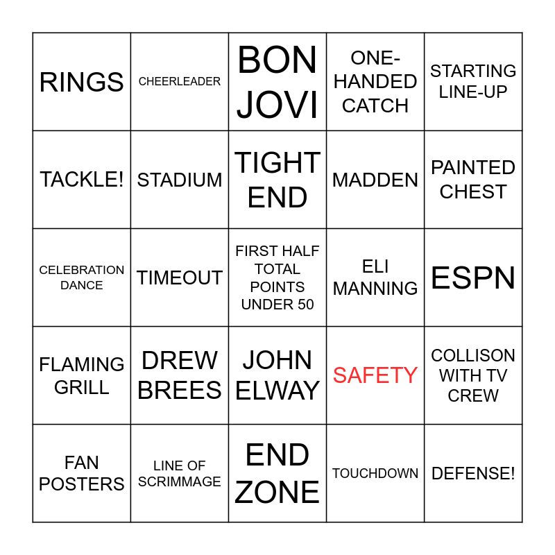 This bingo card has 25 words: DREW BREES, END ZONE, TIGHT END, FAN POSTERS, STARTING LINE-UP, RINGS, TACKLE!, CHEERLEADER, ELI MANNING, JOHN ELWAY, MADDEN, CELEBRATION DANCE, SAFETY, COLLISON WITH TV CREW, STADIUM, DEFENSE!, ESPN, BON JOVI, PAINTED CHEST, TIMEOUT, FIRST HALF TOTAL POINTS UNDER 50, LINE OF SCRIMMAGE, FLAMING GRILL, ONE-HANDED CATCH and TOUCHDOWN.