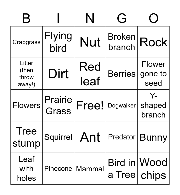 This bingo card has a free space and 24 words: Squirrel, Pinecone, Red leaf, Leaf with holes, Rock, Crabgrass, Litter (then throw away!), Flying bird, Dogwalker, Ant, Berries, Flowers, Predator, Bunny, Dirt, Bird in a Tree, Y-shaped branch, Nut, Flower gone to seed, Prairie Grass, Wood chips, Tree stump, Broken branch and Mammal.