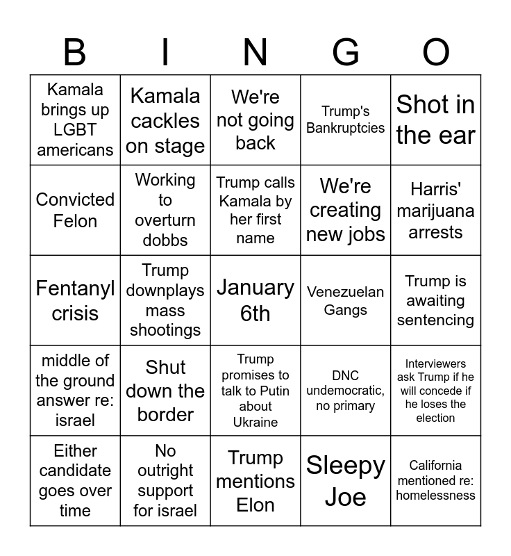 This bingo card has a free space and 24 words: Shut down the border, No outright support for israel, Trump calls Kamala by her first name, Either candidate goes over time, Shot in the ear, Kamala brings up LGBT americans, Convicted Felon, Kamala cackles on stage, Venezuelan Gangs, Trump promises to talk to Putin about Ukraine, We're creating new jobs, Fentanyl crisis, DNC undemocratic, no primary, Interviewers ask Trump if he will concede if he loses the election, Working to overturn dobbs, Sleepy Joe, Trump is awaiting sentencing, We're not going back, Harris' marijuana arrests, Trump downplays mass shootings, California mentioned re: homelessness, middle of the ground answer re: israel, Trump's Bankruptcies and Trump mentions Elon.