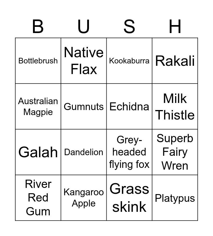 This bingo card has 16 words: Kangaroo Apple, Superb Fairy Wren, Kookaburra, Bottlebrush, Galah, Native Flax, Grey-headed flying fox, Grass skink, Australian Magpie, Gumnuts, River Red Gum, Rakali, Dandelion, Milk Thistle, Echidna and Platypus.