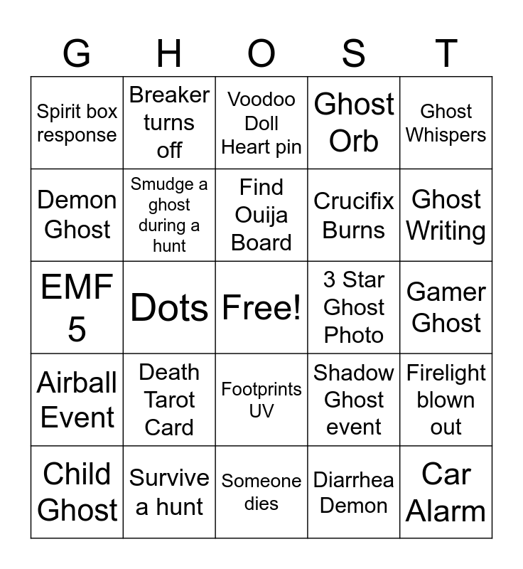 This bingo card has a free space and 24 words: Death Tarot Card, Survive a hunt, Find Ouija Board, Child Ghost, Ghost Whispers, Spirit box response, Demon Ghost, Breaker turns off, 3 Star Ghost Photo, Footprints UV, Crucifix Burns, EMF 5, Shadow Ghost event, Firelight blown out, Smudge a ghost during a hunt, Diarrhea Demon, Gamer Ghost, Voodoo Doll Heart pin, Ghost Writing, Dots, Car Alarm, Airball Event, Ghost Orb and Someone dies.