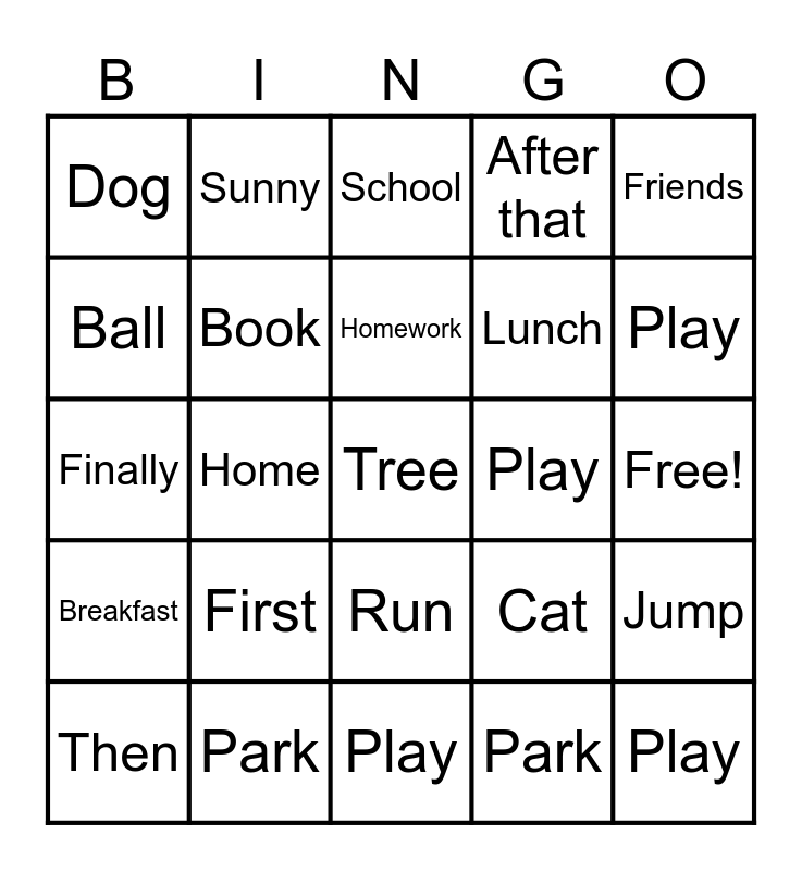 This bingo card has a free space and 24 words: First, Park, Homework, Then, Friends, Dog, Ball, Sunny, Play, Run, Lunch, Finally, Cat, Jump, Book, Park, Free!, School, Play, Home, Play, Breakfast, After that and Play.
