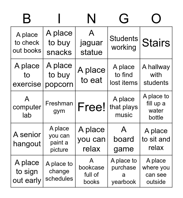 This bingo card has a free space and 24 words: A place you can paint a picture, A place to change schedules, A place to eat, A place to sign out early, Stairs, A place to check out books, A place to exercise, A place to buy snacks, A place that plays music, A place you can relax, A place to find lost items, A computer lab, A board game, A place to sit and relax, A place to buy popcorn, A place to purchase a yearbook, A place to fill up a water bottle, A jaguar statue, A hallway with students, Freshman gym, A place where you can see outside, A senior hangout, Students working and A bookcase full of books.