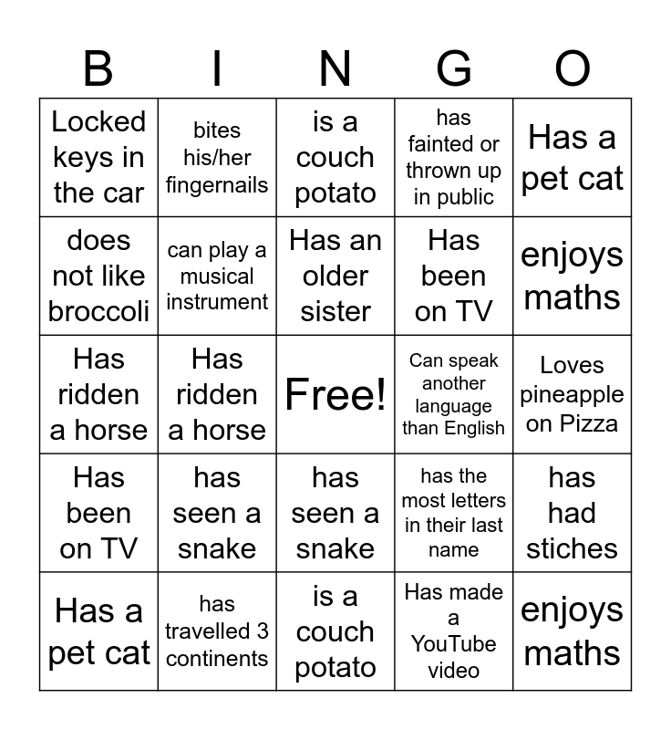 ⚠ This card has duplicate items: hasn't had breakfast today (2), enjoys maths (2), won a contest (2), is a couch potato (2), has seen a snake (2), likes very spicy food (2), was born in January (2), does not like broccoli (2), has travelled 3 continents (2), can play a musical instrument (2), has fainted or thrown up in public (2), has had stiches (2), has the most letters in their last name (2), Loves pineapple on Pizza (2), Does yoga (2), Has an older sister (2), Can speak another language than English (2), Never been on an airplane (2), Has a pet cat (2), Has ridden a horse (2), Has made a YouTube video (2), Locked keys in the car (2), Has been on TV (2), Is an influencer (2)