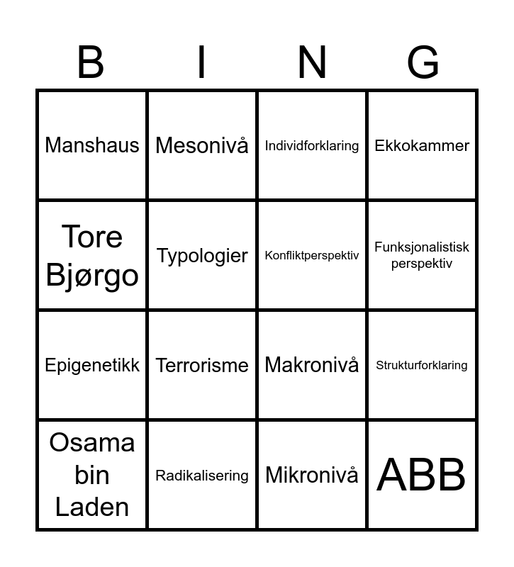 This bingo card has 16 words: Radikalisering, Strukturforklaring, Individforklaring, Manshaus, Epigenetikk, Mesonivå, Makronivå, Mikronivå, Tore Bjørgo, Typologier, Osama bin Laden, Ekkokammer, Terrorisme, Funksjonalistisk perspektiv, Konfliktperspektiv and ABB.