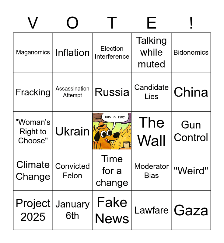 This bingo card has a free space and 24 words: Convicted Felon, January 6th, Russia, Project 2025, Bidonomics, Maganomics, Fracking, Inflation, The Wall, Time for a change, Candidate Lies, "Woman's Right to Choose", Moderator Bias, "Weird", Assassination Attempt, Lawfare, Gun Control, Election Interference, China, Ukrain, Gaza, Climate Change, Talking while muted and Fake News.